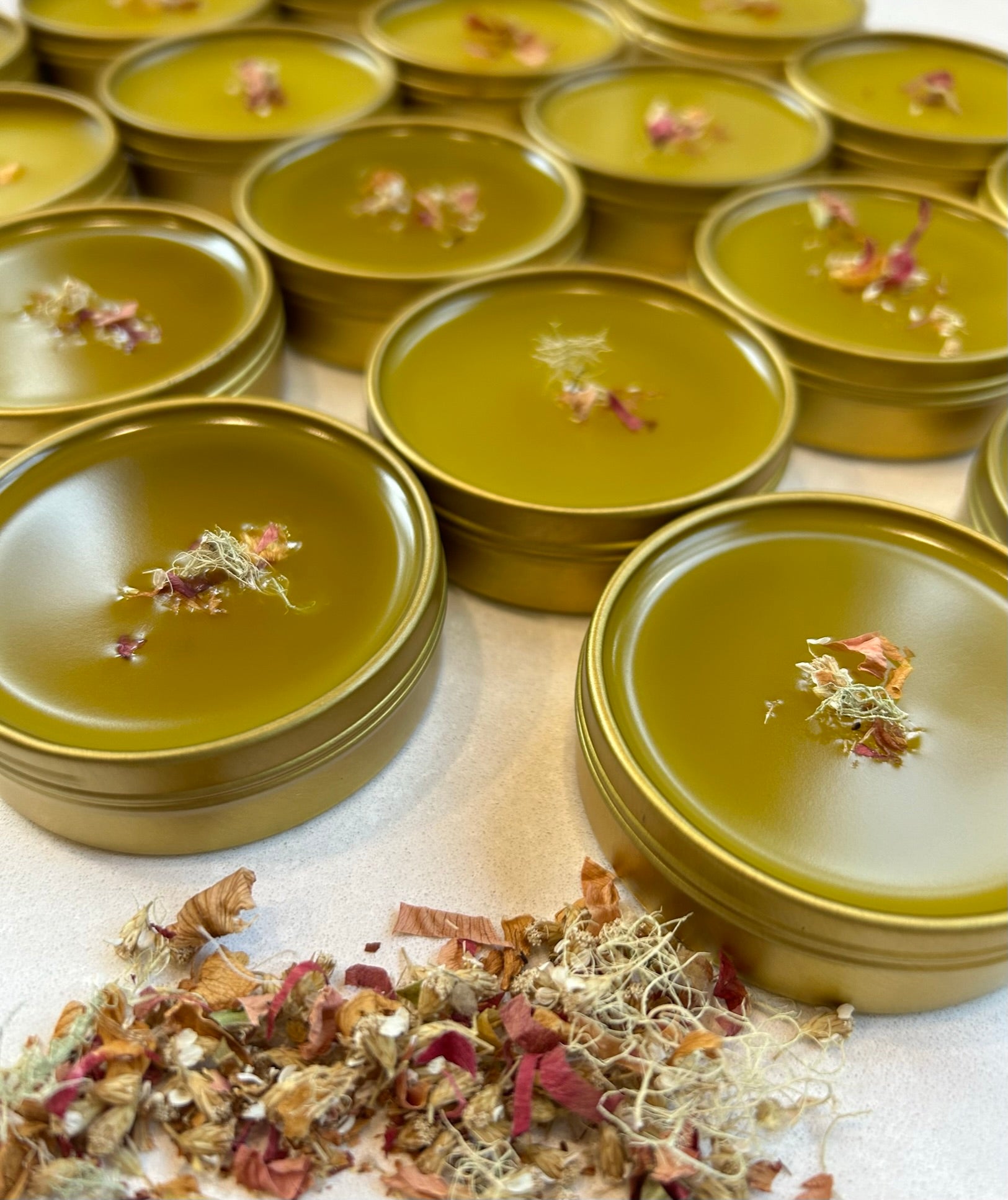 Ingredients: Ethically gathered Whidbey Island wild rose petals and buds, stinging nettles, and yarrow (both wild gathered and grown at Ritual Mischief) and windfall western red cedar and usnea lichen (gathered off nearby forest floors after winter windstorms) and Hawthorn berries (gathered from a beloved stand in the Skagit valley) infused into olive oil for 6 weeks to 4 months (lichen) depending on the plant, plus local beeswax, dried Whidbey rose petals and yarrow and windfall usnea (sprinkled on top), and two drops of rose absolute (rose in jojoba oil) essential oil.