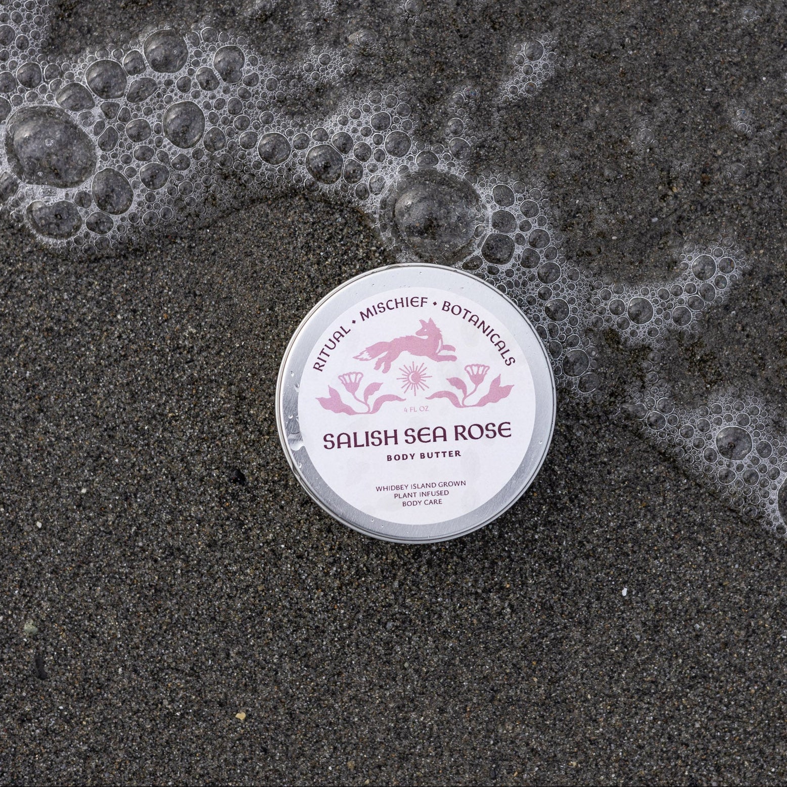 Wrap your skin in the wild, briny beauty of the sea with Salish Sea Rose Body Butter. We blend organic shea butter and coconut oil with ethically wild-harvested rugosa rose petals and coastal kelp that are slow-infused in organic olive oil to create a deeply nourishing, ritual-ready balm. Rich in vitamins, minerals, and antioxidants, kelp helps hydrate and protect your skin while supporting a radiant glow.
