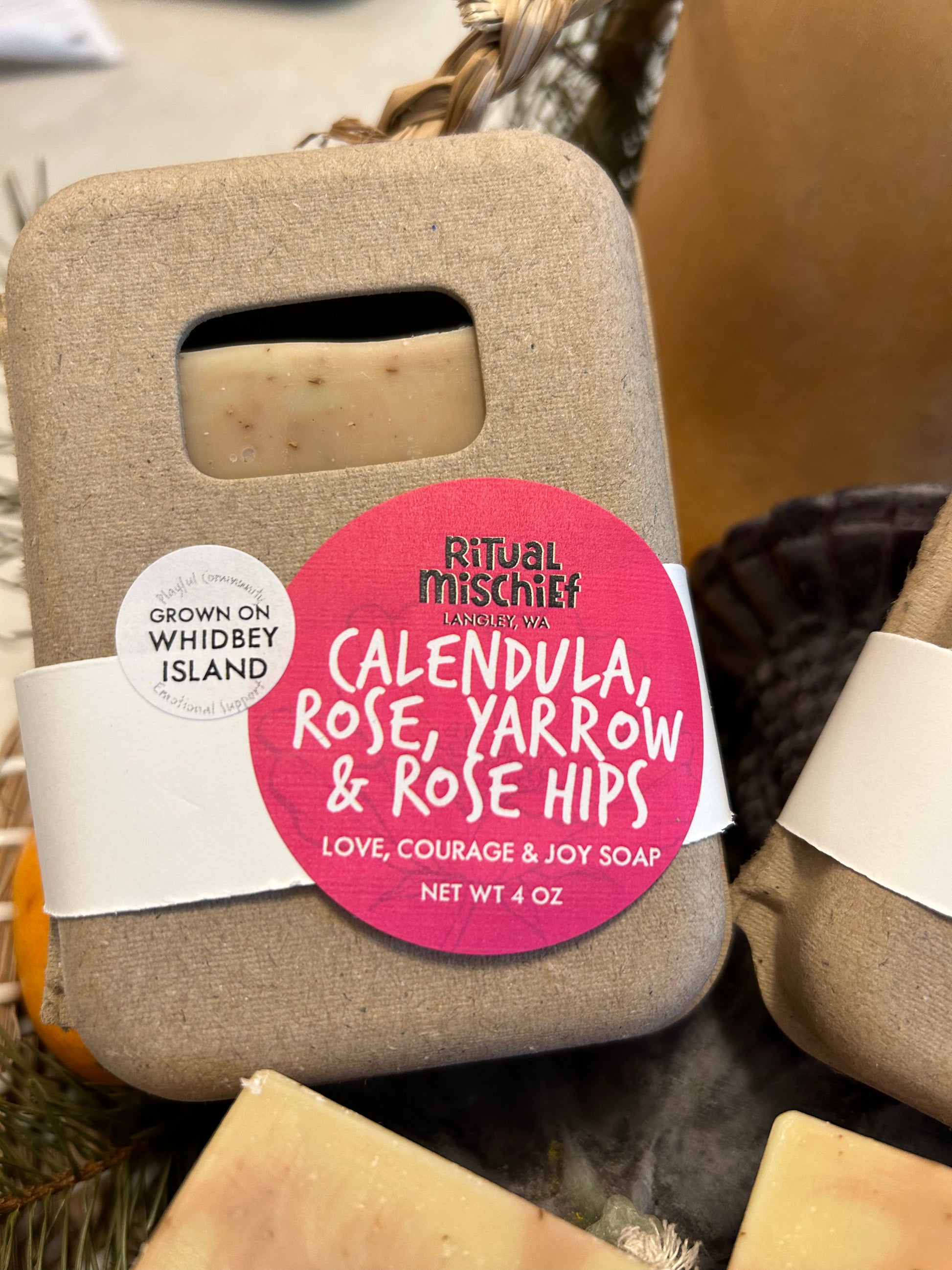 Ingredients: Whidbey yarrow, wild rose hips, rose petals, and calendula flowers gathered by us and infused into an organic/trusted non-organic olive oil blend, plus organic coconut oil, Shea butter, castor oil, Whidbey rose petal & calendula distilled water tea, sodium hydroxide, sodium lactate, kaolin and rose clays, ground Whidbey rose petals, rose absolute essential oil (jojoba oil with rose essential oil in it).