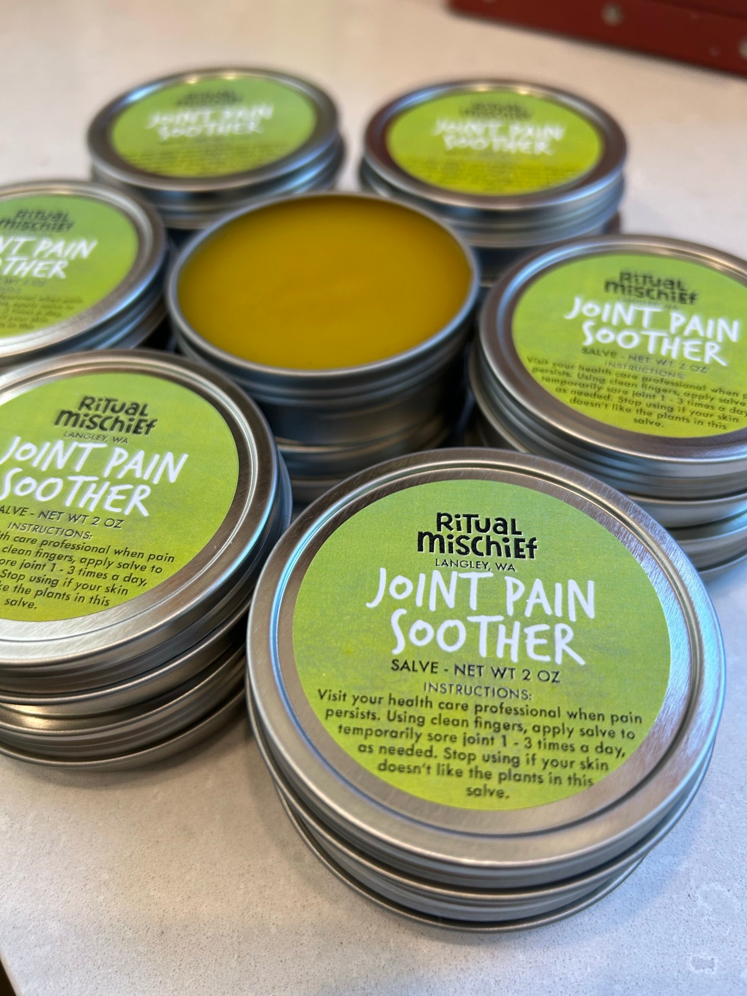 To use: Apply to sore joints using clean fingers, one to three times a day, as needed. Stop using if your skin doesn't like the plants in this salve. Visit your health care professional if pain persists.