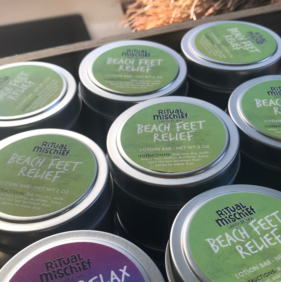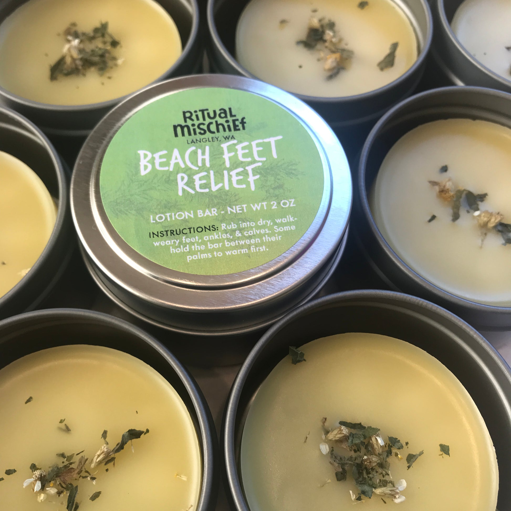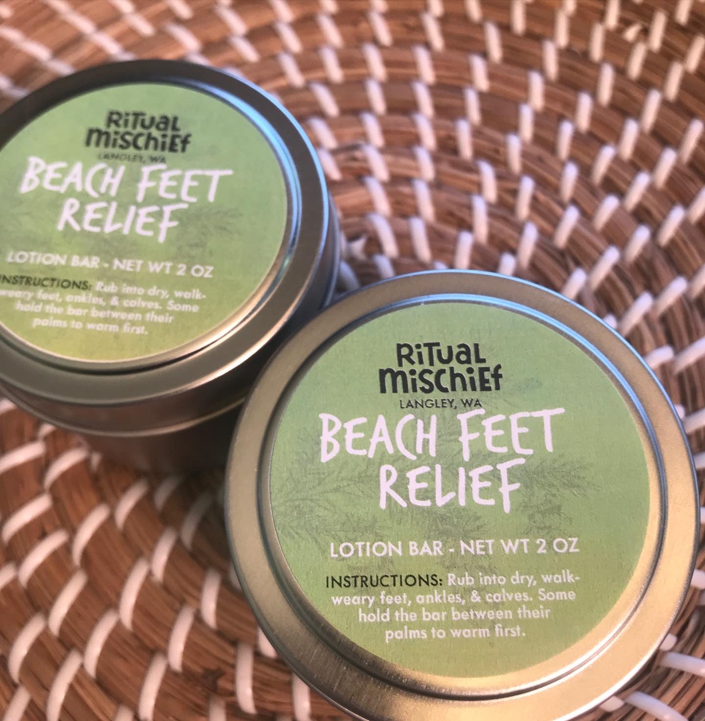 Important: This lotion bar is for softening dry, scuffed, and scraped up feet when you're back home after time out on the beach or work or hiking or elsewhere. If you actually cut your foot, seek help. Our Whidbey Boo Boo salve can help with minor cuts. But don't mess around with larger cuts. Get yourself medical help ASAP! Love those feet. They deserve it. All feet do.