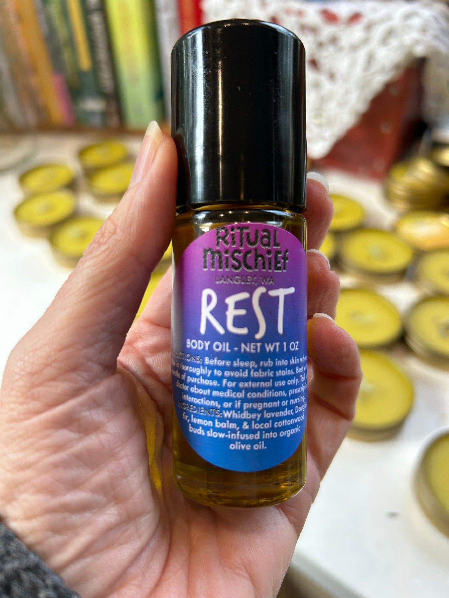 Ingredients: Our own lavender and lemon balm, and Whidbey windfall Douglas Fir branches, and local windfall black cottonwood buds (from beloved trees on Whidbey, along the Skagit river, and/or from Mountain Tree Farm in Arlington) infused in olive oil and 1 drop of lavender essential oil.